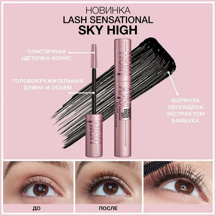 Maybelline New York Тушь для ресниц Lash Sensational Sky High, черная удлиняющая объемная, цвет Black Чёрный, 7.2 мл Водостойкий