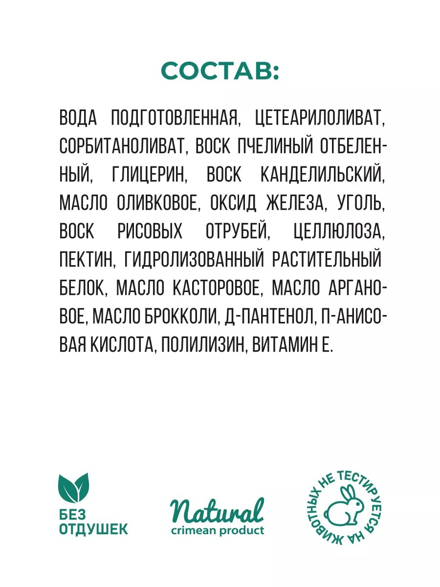 | Состав | вода подготовленная, цетеарилоливат, сорбитаноливат, воск пчелиный отбеленный, глицерин, воск канделильский, масло оливковое водорастворимое, оксид железа, уголь, воск рисовых отрубей, целлюлоза, пектин, гидролизованный растительный белок, масло касторовое, масло аргановое, масло брокколи, Д-пантенол, п-анисовая кислота, полилизин, витамин Е |