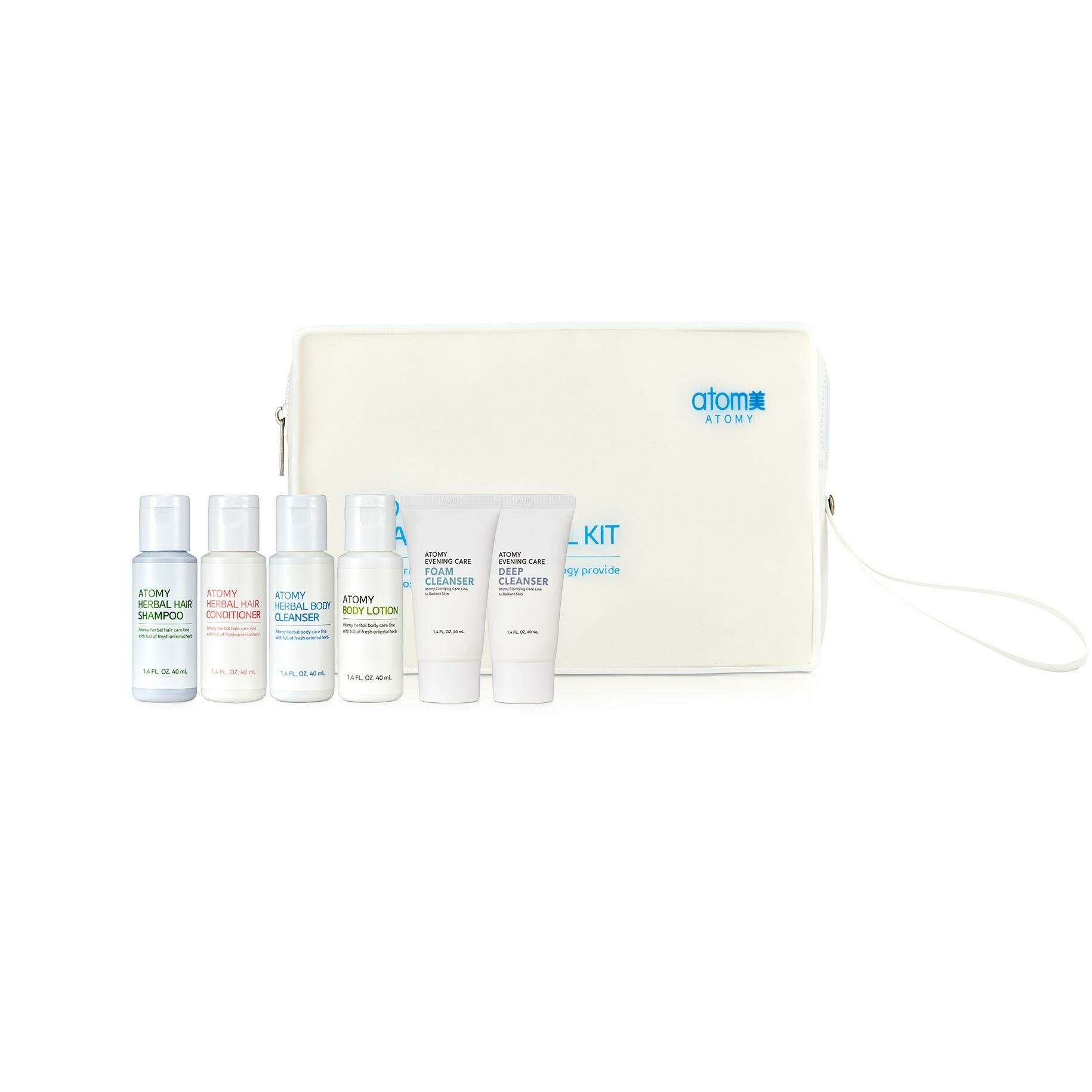 | В наборе | Дорожный набор 6 включает: Атоми Ивнинг Кеар глубокое очищение 40 мл Атоми Ивнинг Кеар очищающая пенка 40 мл Атоми Хербал шампунь для волос 40 мл Атоми Хербал кондиционер для волос 40 мл Атоми Хербал гель для душа 40 мл Атоми Лосьон для тела питательный 40 мл |
