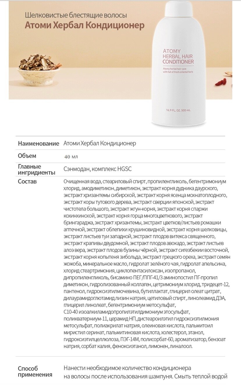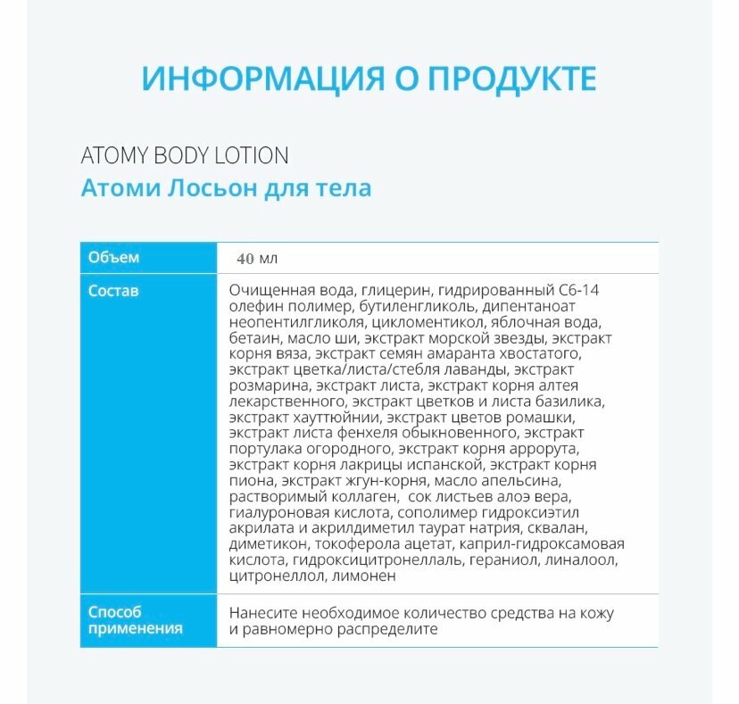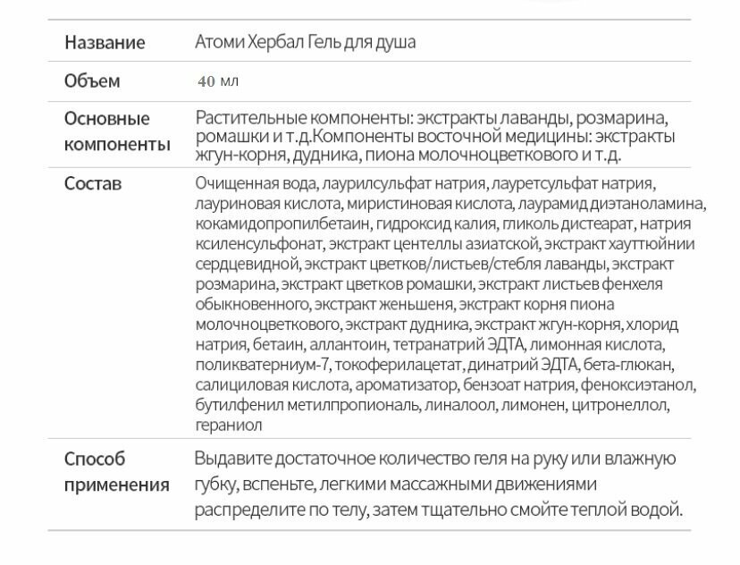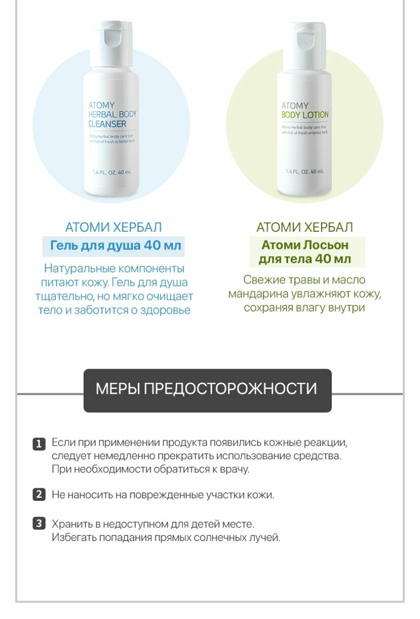 | Состав | Шампунь Atomy Herbal Hair 40 мл. Кондиционер Atomy Herbal Hair 40 мл. Гель для душа Atomy Herbal body 40 мл. Лосьон для тела Atomy Body lotion / 40 мл. Гидрофильное масло Atomy Deep Cleanser 40 мл. Пенка для умывания Atomy Foam Cleanser 40 мл. |