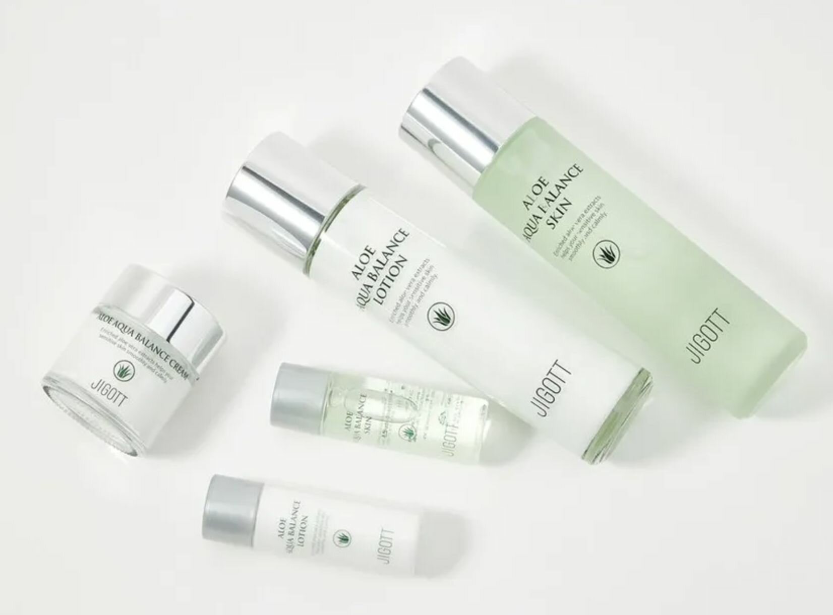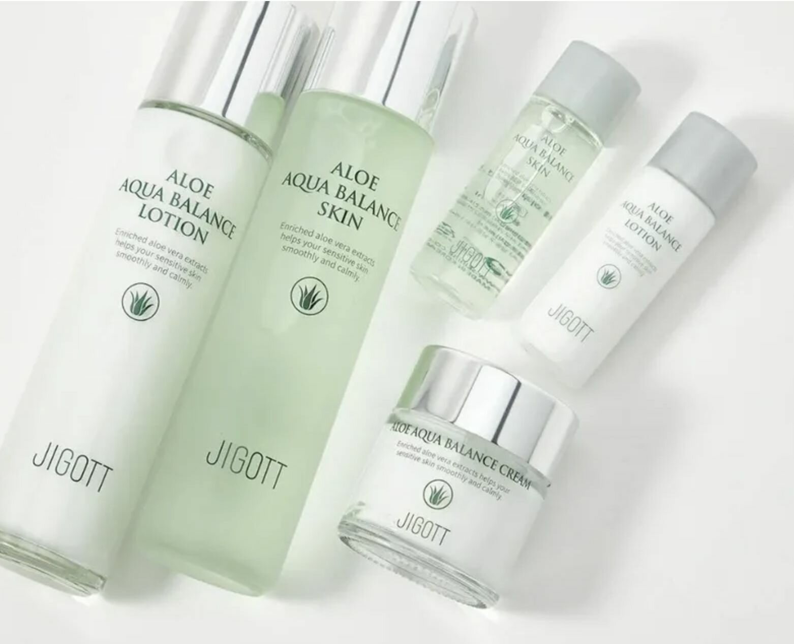 Jigott Набор для ухода за кожей лица с экстрактом алоэ Aloe Aqua Balance Skin Care 3 Set (тонер, лосьон, крем), 150 мл+150 мл+30 мл+30 мл+50 мл