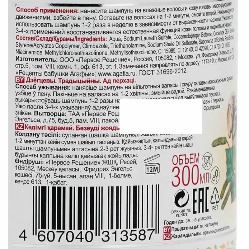 | Способ применения | нанесите шампунь на влажные волосы и кожу головы массирующими движениями, вбейте в пену. Оставьте на волосах на 1-2 минуты, смойте водой. Рекомендуется использовать шампунь 1-2 раза в неделю в зависимости от выраженности перхоти |