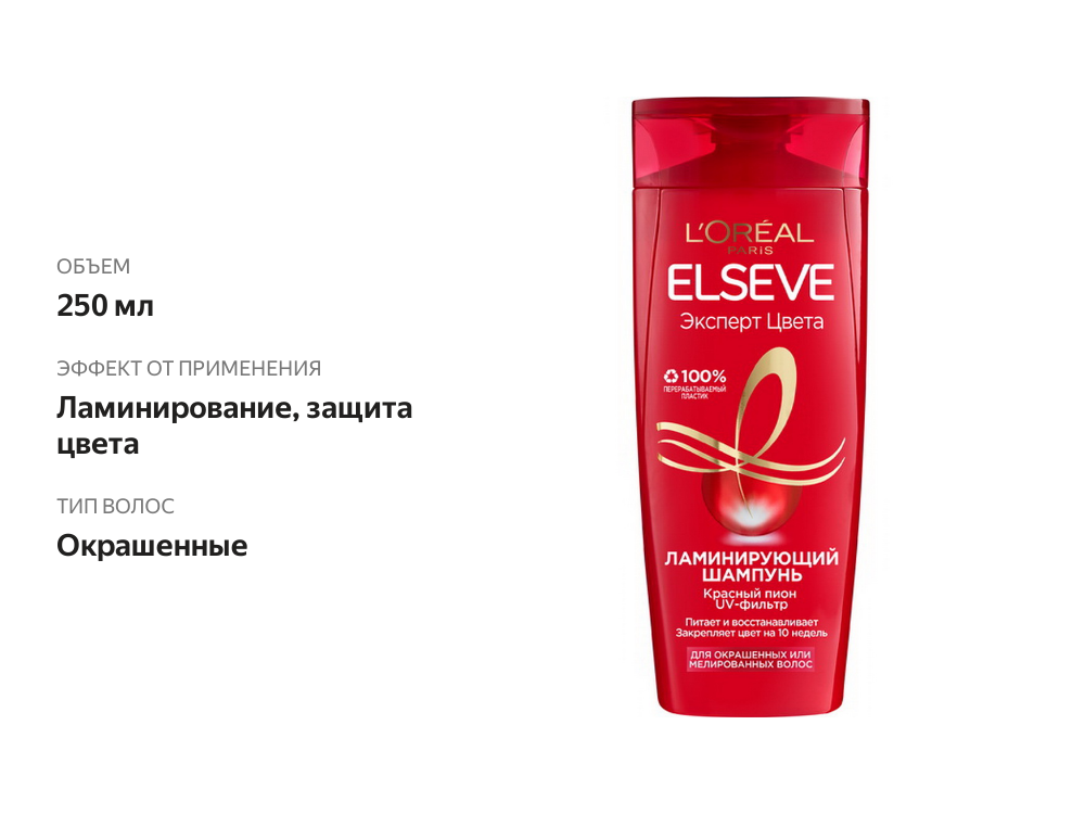 L'Oreal Paris Elseve Ламинирующий шампунь "Эльсев, Эксперт Цвета", для окрашенных или мелированных волос, 250 мл