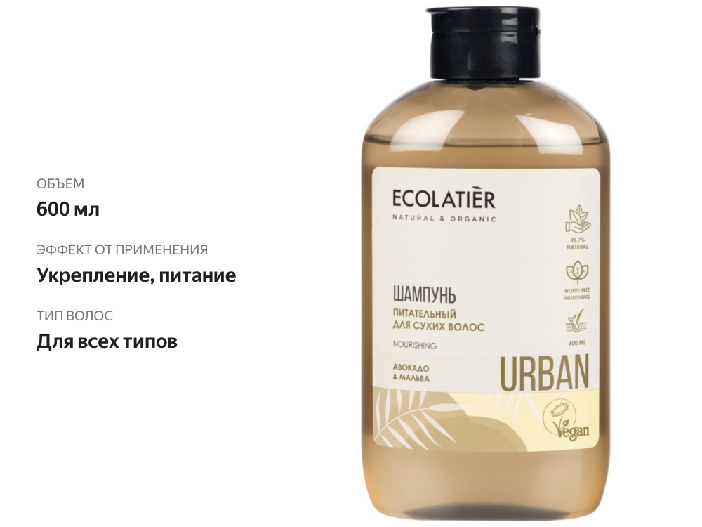 | Дополнительная информация | Шампунь ECOLATIER URBAN, благодаря входящим в состав натуральным ингредиентам, заботится о волосах, укрепляет и питает их. Придает волосам ухоженный, здоровый вид. Продукт содержит более 98% ингредиентов растительного происхождения. АКТИВНЫЕ ИНГРЕДИЕНТЫ: Сок Алоэ Вера деликатно очищает волосы и кожу головы, укрепляет корни, активизирует рост волос, питает и увлажняет сухие локоны. Комплекс растительных протеинов (протеины Пшеницы, Ржи и Овса) проникает в структуру каждого волоса, наполняет его, придает прочность и целостность, обеспечивает объем. При регулярном использовании шампунь оказывает накопительный эффект, многократно усиливает блеск волос, заметно увеличивает их объем. Результат: волосы более плотные, объемные, сильные. Сок дерева Кротон Лехлера (Кровь Дракона), экстракт моринги, витамины В5, В6, С, Е стимулируют детокс клеток, регенерируют кожу, проявляют высокую антиоксидантную активность и улучшают барьерные функции кожи. |