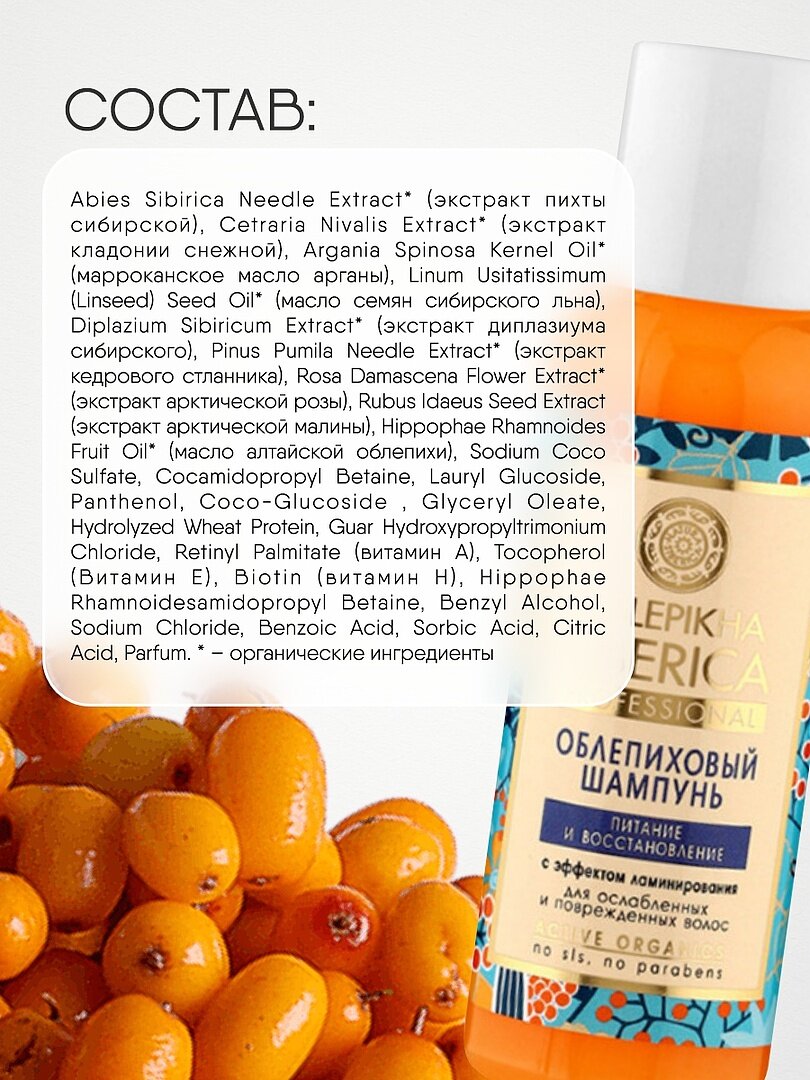 | Состав | aqua with infusions of: abies sibirica needle extract (экстракт пихты сибирской), cetraria nivalis extract (экстракт кладонии снежной), argania spinosa kernel oil (марроканское масло арганы), linum usitatissimum (linseed) seed oil (масло семян сибирского льна), diplazim sibiricum extract (экстракт диплазиума сибирского), pinus pumila needle extract (экстракт кедрового стланника), rosa damascena flower extract (экстракт арктической розы), rubus idaeus seed extract (экстракт арктической малины), hippophae rhamnoides fruit oil (масло алтайской облепихи), sodium coco-sulfate, cocamidopropyl betaine, lauryl gluciside, panthenol, coco-glucoside, glyceryl oleate, hydrolyzed wheat protein, guar hydroxypropyltrimonium chloride, retinyl palmitate (витамин а), tocopherol (витамин e), biotin (витамин н), hippophae rhamnoidesamidopropyl betaine, benzyl alcohol, sodium chloride, benzoic acid, sorbic acid, citric acid, parfum |