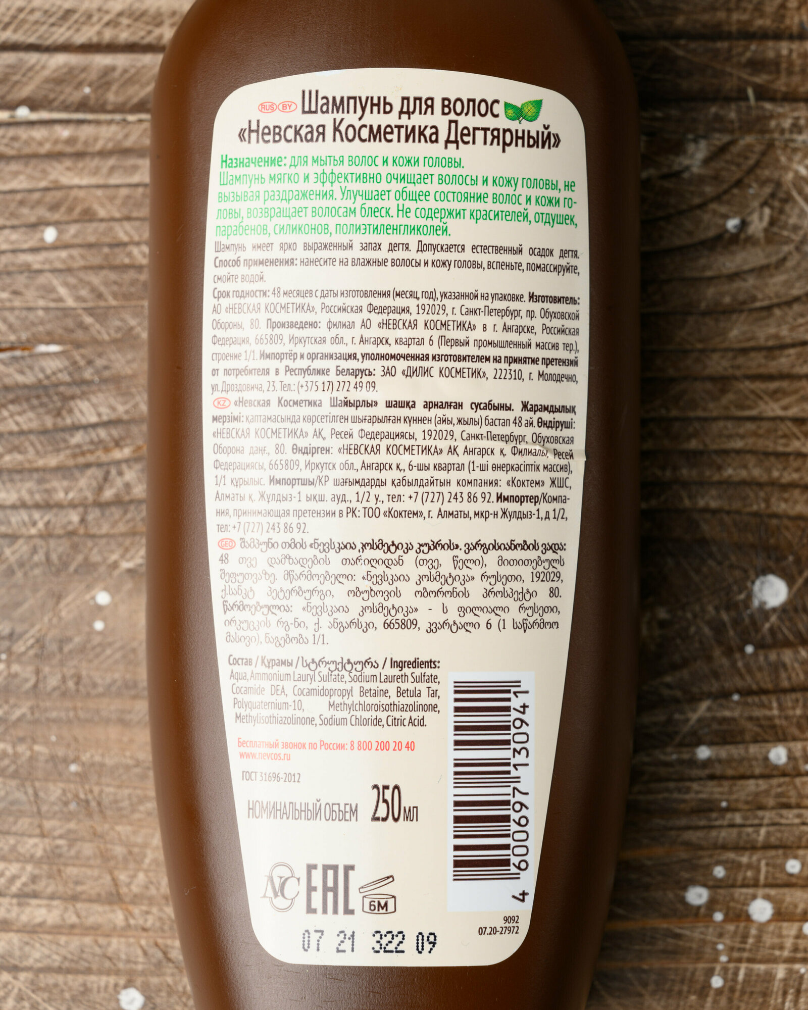 | Состав | Aqua, Ammonium Lauryl Sulfate, Sodium Laureth Sulfate , Cocamide DEA, Cocamidopropyl Betaine, Betula Tar, Polyquaternium-10, Methylchloroisothiazolinone, Methylisothiazolinone, Sodium Chloride , Citric Acid. |