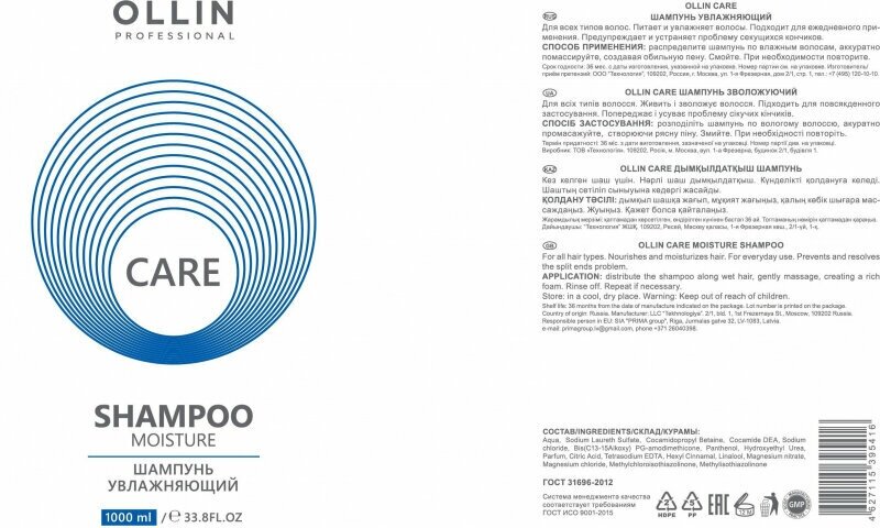 OLLIN CARE Шампунь увлажняющий 1000мл/Moisture Shampoo