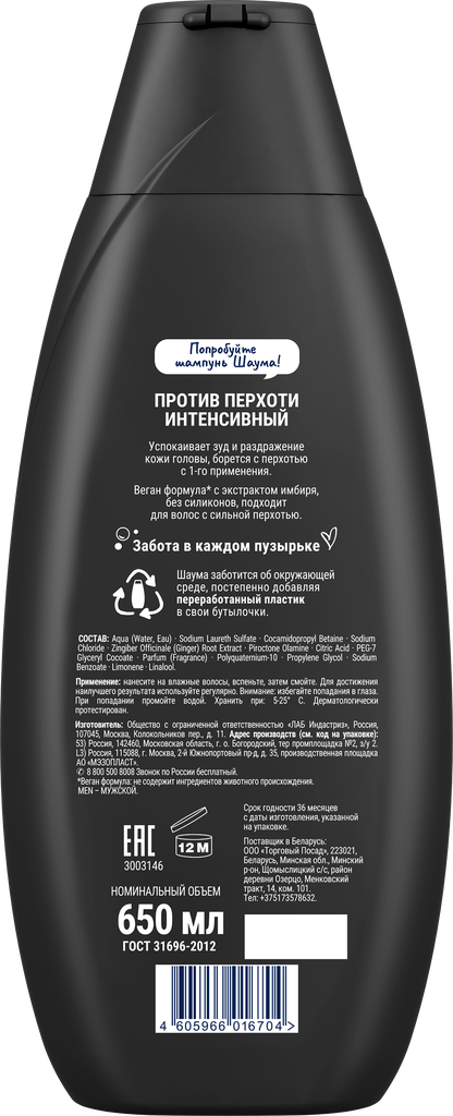 | Дополнительная информация | шампунь Schauma для мужчин Intensive:• Борется с сильной перхотью с 1-го применения, защищает от повторного появления перхоти до 6 недель |