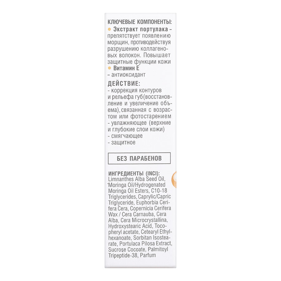 | Состав | Limnanthes alba seed oil, moringa oil/hydrogenated moringa oil esters, c10-18 triglycerides, caprylic/capric triglyceride, candelilla cera. Copernicia cerifera wax (cera carnauba), cera alba, cera microcrystallina, hydroxystearic acid, tocopheryl acetate, cetearyl ethylhexanoate, sorbitan isostearate, Portulaca pilosa extract, sucrose cocoate, palmitoyl tripeptide-38, parfum |