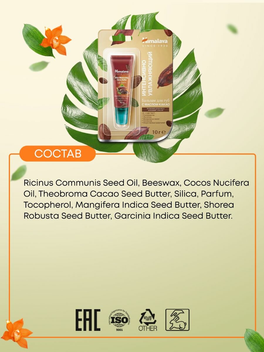 СохранитьБальзам для губ интенсивно увлажняющий с маслом какао без парабенов и парафинов, Himalaya (Хималайя), 10г интересное: