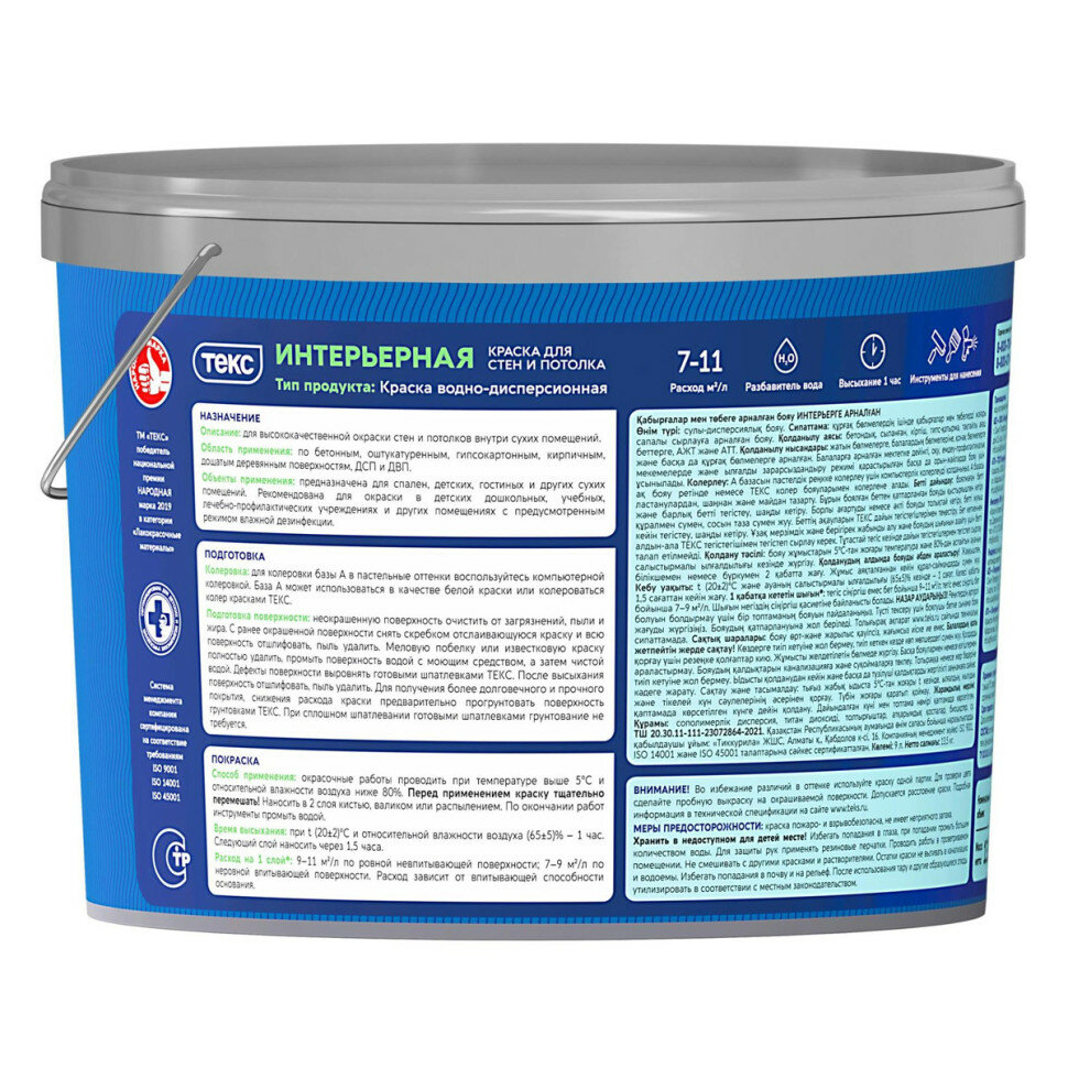 Краска интерьерная для стен и потолков Текс Профи, база A, белая, 9 л