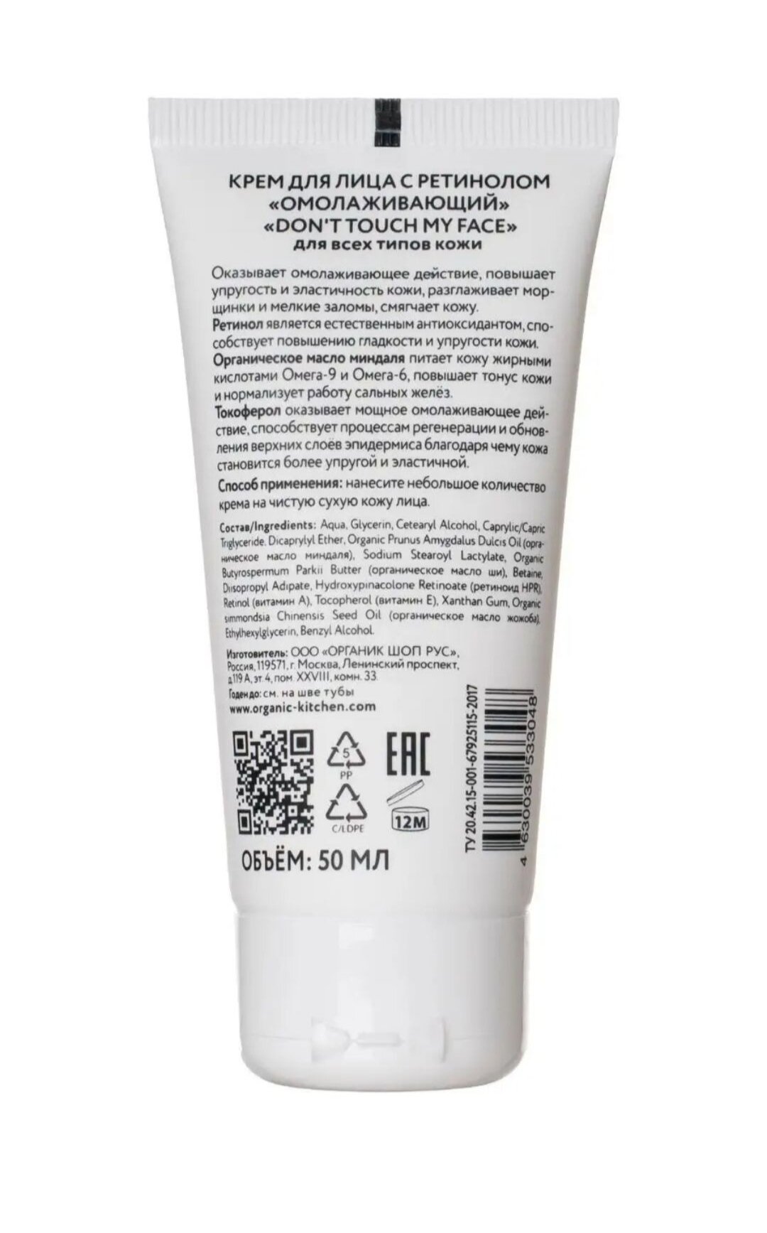 Омолаживающий крем для лица с ретинолом Organic Kitchen Don't Touch my Face антивозрастной питательный увлажняющий 50 мл интересное: