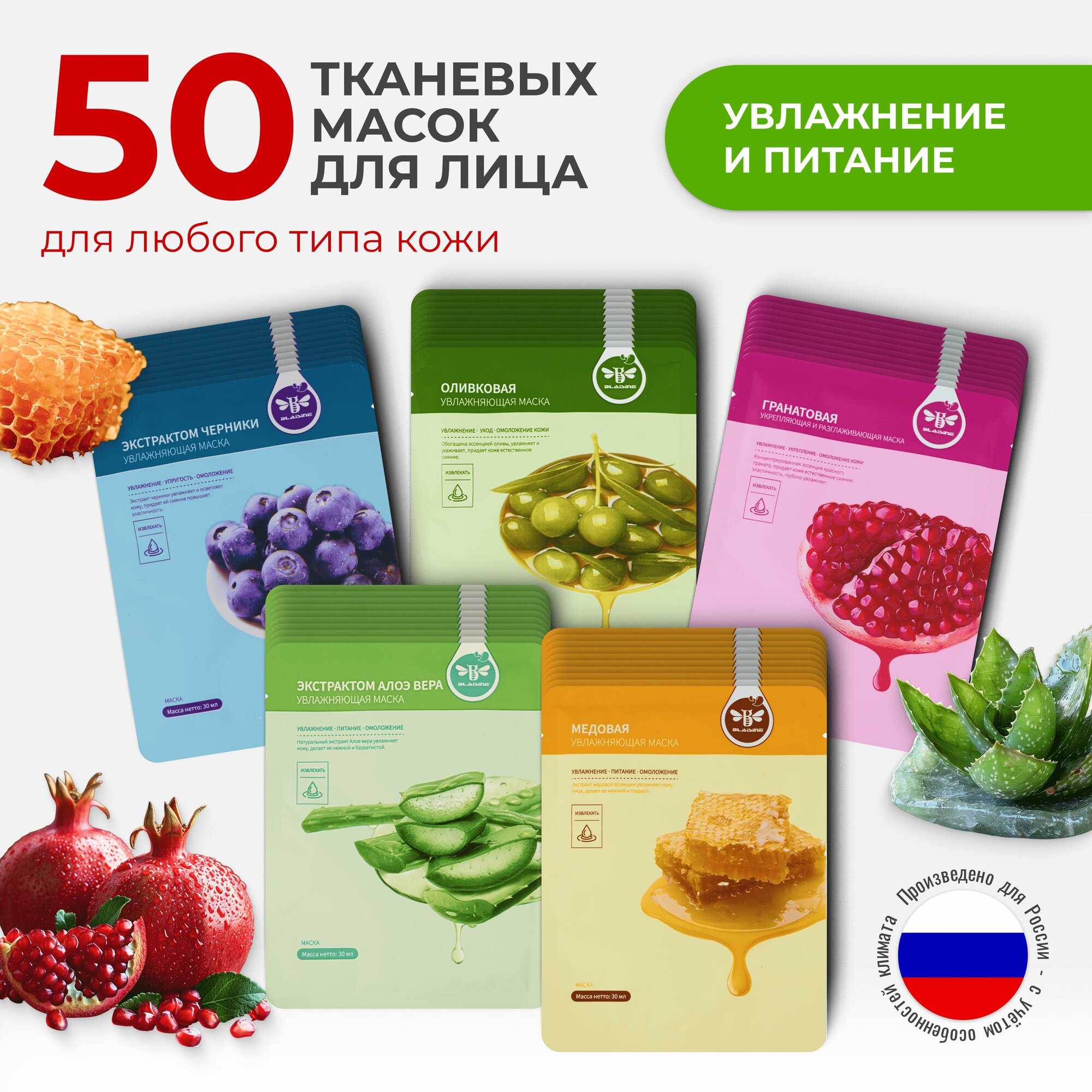 Маска для лица тканевая набор BLAISINE / уходовый набор тканевых масок для лица 50 штук