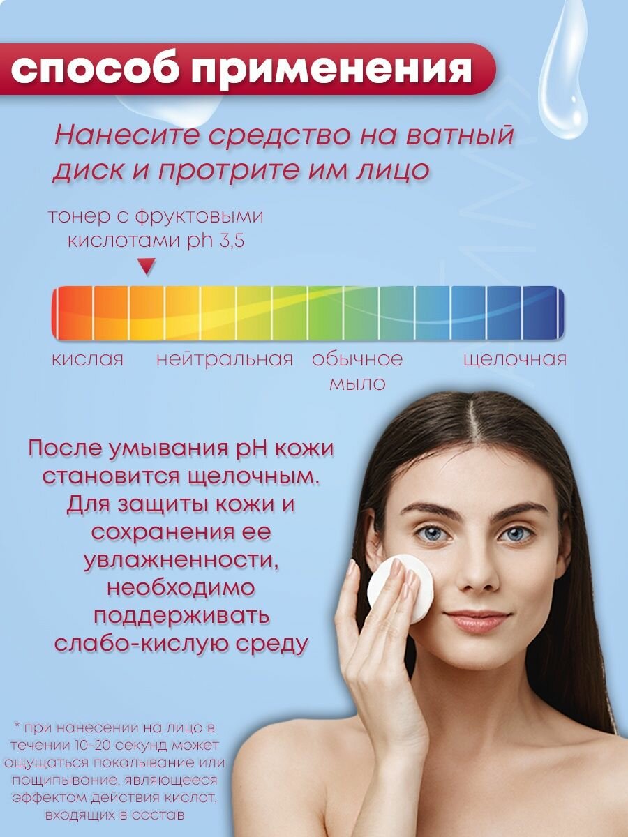 | Способ применения | Смочить ватный диск нужным количеством и аккуратно протереть лицо, избегая зоны вокруг глаз. Перед использованием ОБЯЗАТЕЛЬНО протестировать на запястье за сутки до использования на лице! В дальнейшем можно применять его ежедневно. |