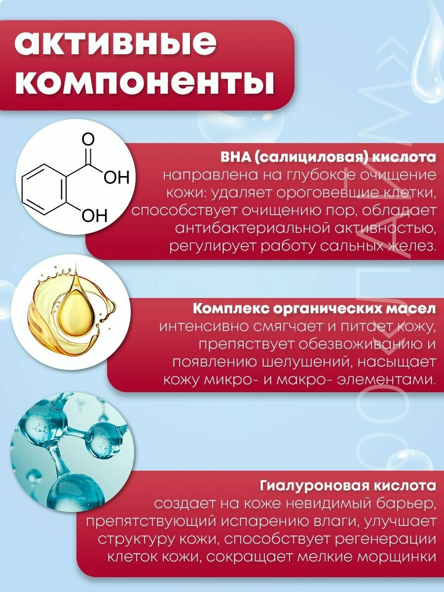 | Активный ингредиент | AHA-кислоты / витамины группы В / гиалуроновая кислота / гликолевая кислота / глицерин / пантенол / салициловая кислота / фруктовые кислоты |