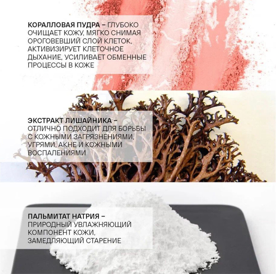 | Отшелушивающее вещество | коралловая пудра / целлюлоза / частицы водорослей |