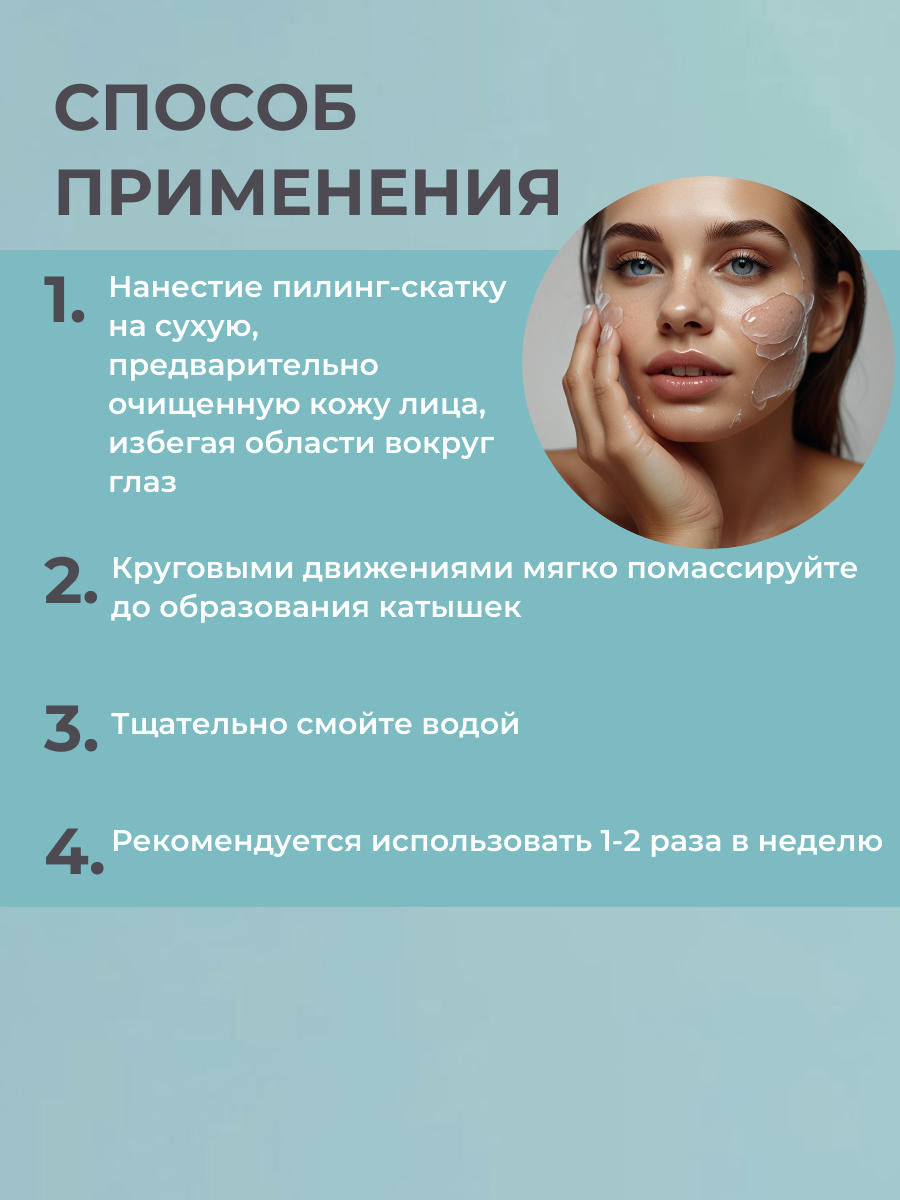 | Способ применения | нанесите пилинг-скатку на сухую, предварительно очищенную кожу лица, избегая области вокруг глаз, круговыми движениями мягко помассируйте до образования катышек, тщательно смойте водой. Рекомендуется использовать 1-2 раза в неделю |