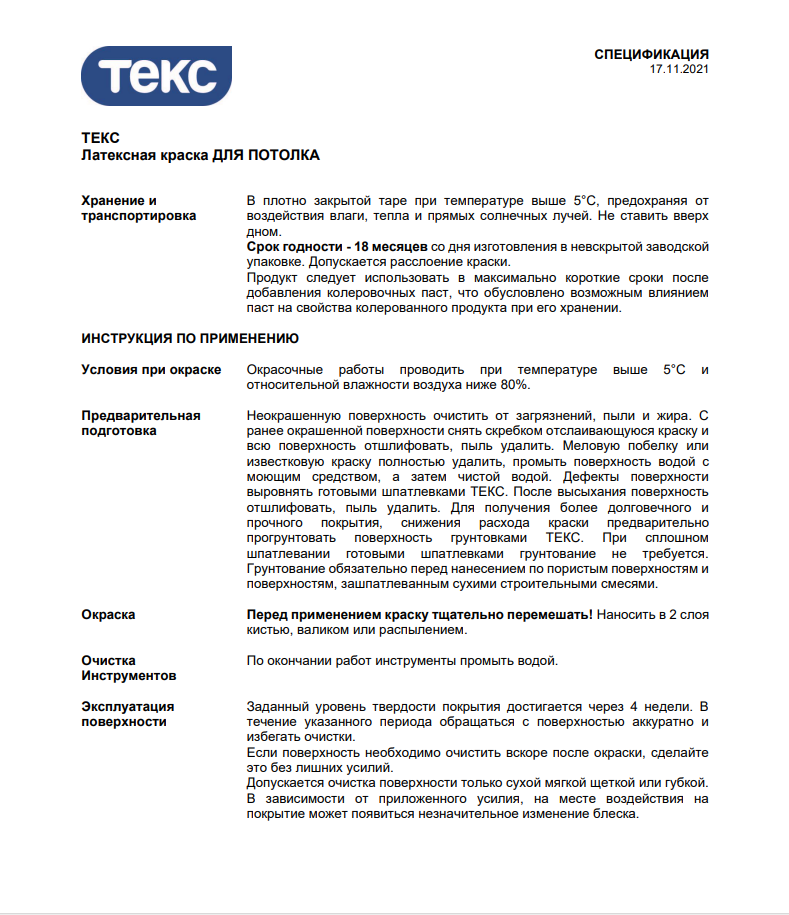 Текс Для потолков краска водно-дисперсионная (14кг) / текс Для потолка краска водоэмульсионная (14кг) класс универсал