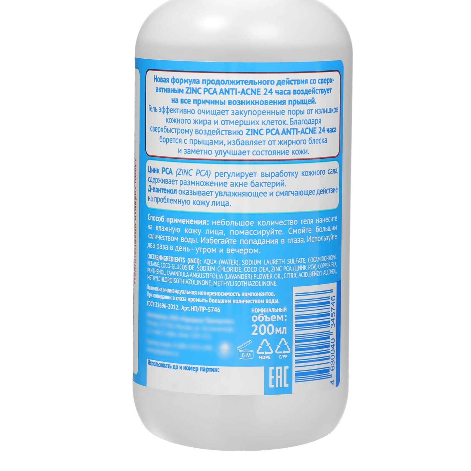 | Способ применения | выдавить каплю геля на ладони и растереть с водой до образования пены. Затем нанести пену на кожу лица и мягко помассировать. Смыть прохладной водой |