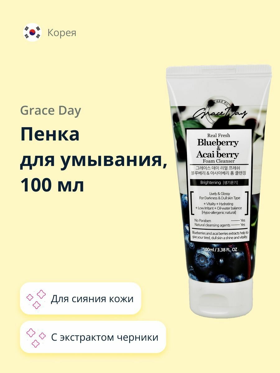 Grace Day Пенка для умывания, для снятия остатков макияжа, для ухода за кожей лица, шеи и зоны декольте с экстрактами черники и ягод асаи, корейская косметика. 100мл