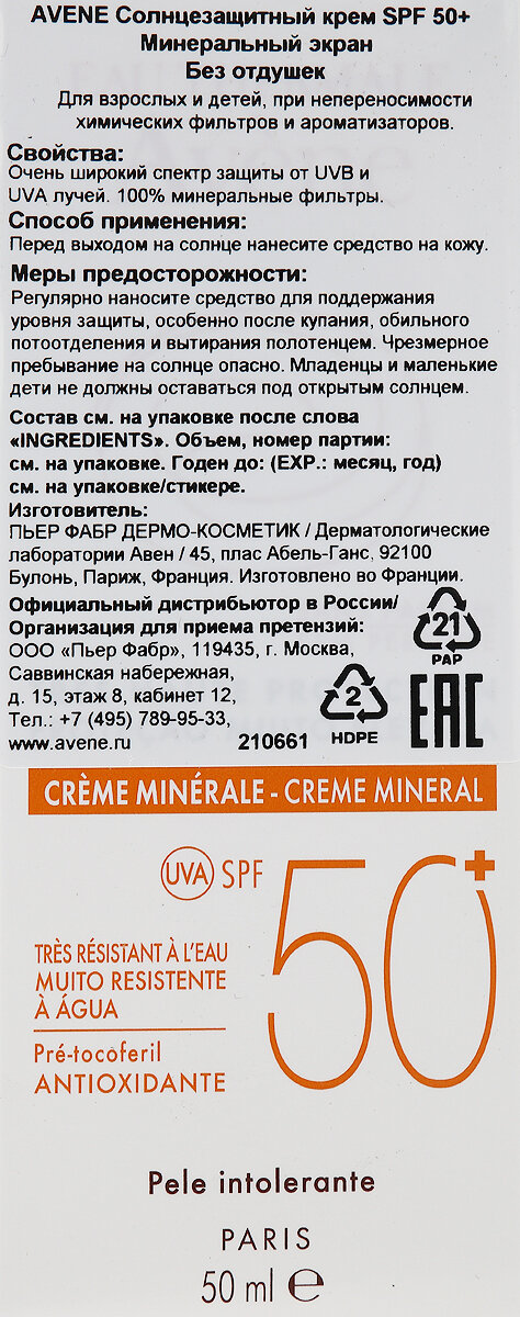 Avene солнцезащитный крем с минеральным экраном SPF50+ 50 мл 1 шт интересное: