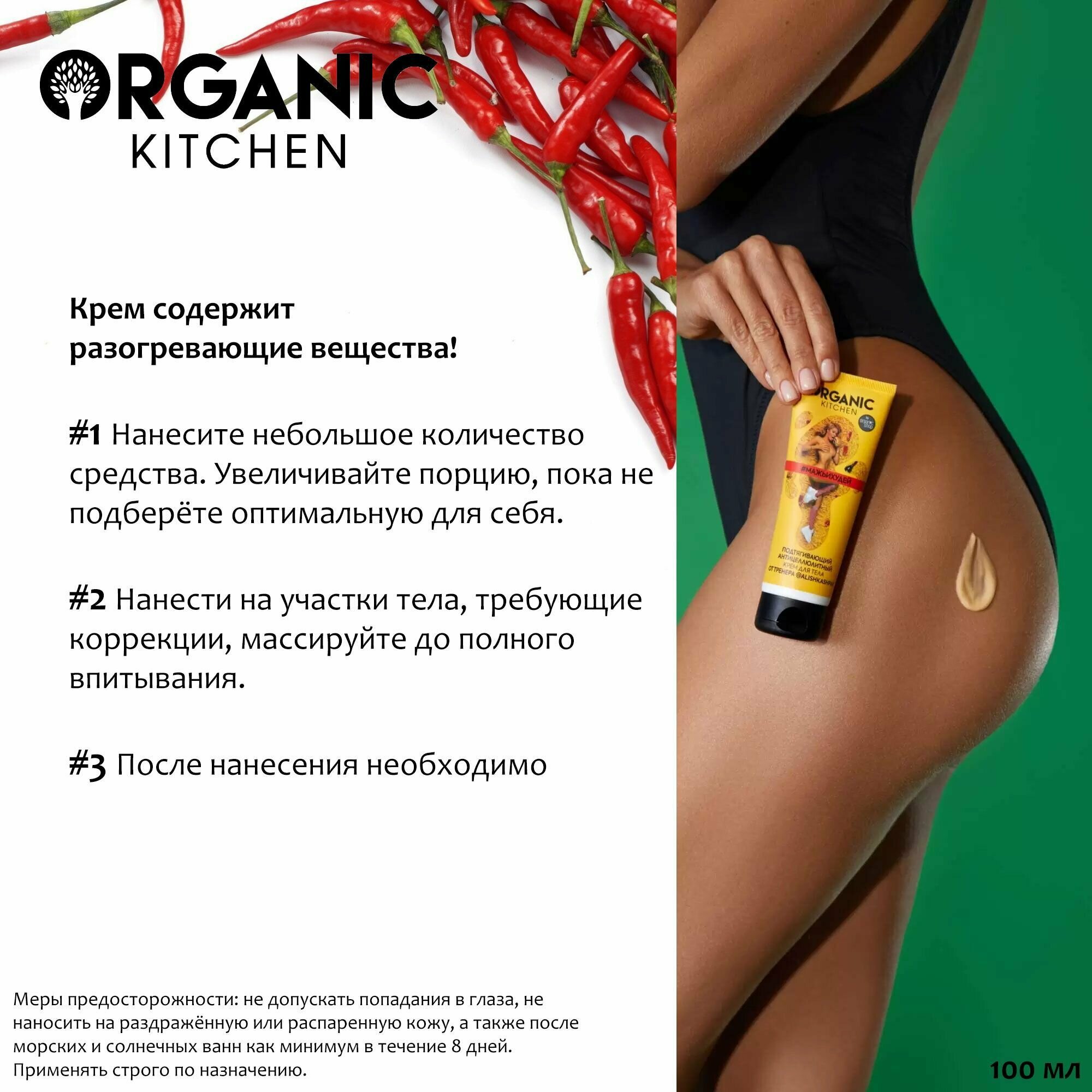 | Дополнительная информация | Крем для тела “#Мажьихудей” от тренера Алины Шпак - это лучший уход для вашей кожи. Антицеллюлитный подтягивающий крем для тела от Organic Kitchen содержит мощную формулу активных веществ, которые в кратчайшие сроки способствуют улучшению качества вашего тела. Создано специально для безопасного и бережного ухода за кожей. Уход за телом очень важен, наша кожа нуждается в заботе, увлажнении и защите. Крем для тела антицеллюлитный содержит экстракт конского каштана, который оказывает дренажный противоотечный эффект, повышает тонус кожи. Кофеин минимизирует проявления «апельсиновой корки». Экстракт перца оказывает разогревающее действие, при регулярном применении способствует уменьшению жировых отложений, улучшает обменные процессы в тканях. Гликолевая кислота стимулирует клеточное обновление. Такая уходовая косметика для тела - это качественное и эффективное питание вашей кожи. Отличный подарок маме, сестре, бабушке, подруге и любым близким людям. |