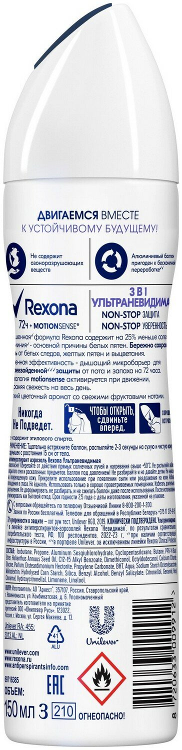 Купить Rexona Дезодорант-антиперспирант аэрозоль Ультраневидимый 72 часа защиты 150 мл - 1 шт