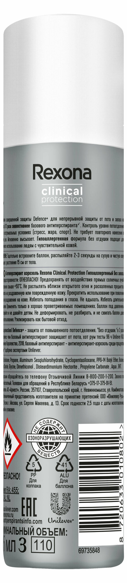 Антиперспирант Аэрозоль Rexona Clinical Protection Гипоаллергенный без Запаха 150мл 8720633009974