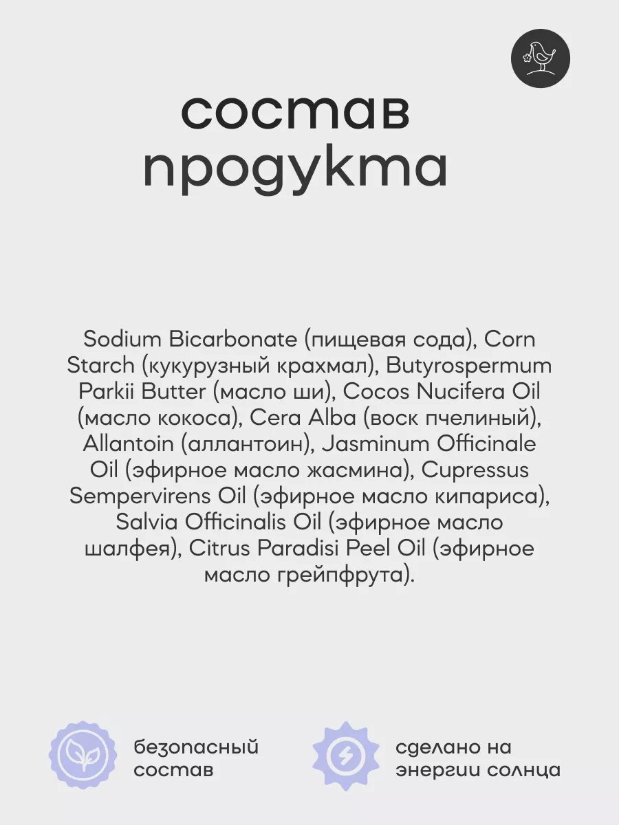 | Полный состав | Sodium Bicarbonate (Сода пищевая), Corn Starch (Кукурузный крахмал), Cocos Nucifera Oil (Масло кокоса), Butyrospermum Parkii Butter (Масло ши), Cera Alba (Воск пчелиный), Allantoin (Аллантоин), Lavandula Angustifolia Oil (Эфирное маслолаванды), Parfum (Парфюмерная композиция). |