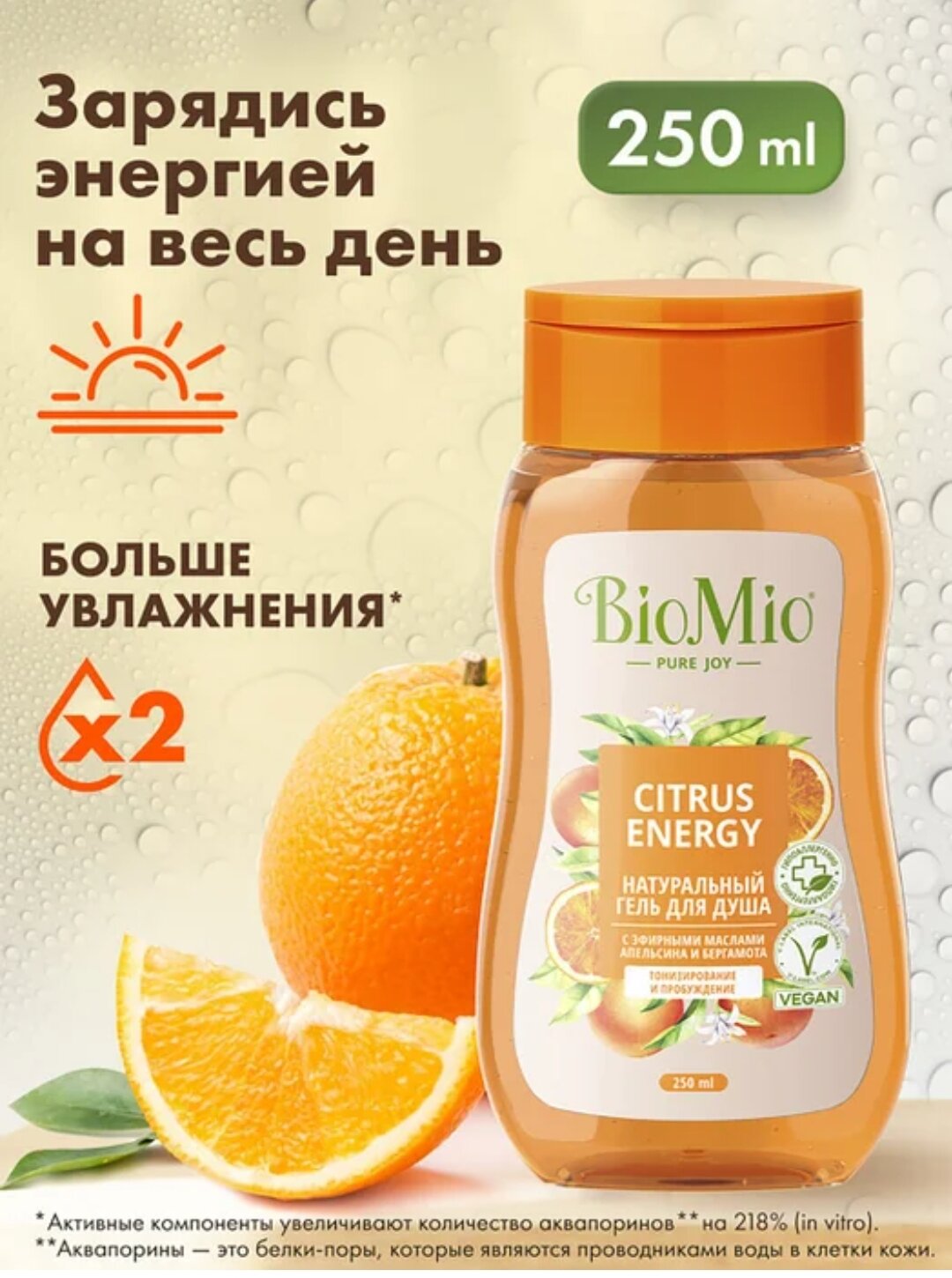 Гель для душа натуральный BioMio Bio Shower Gel "Citrus Energy" с эфирными маслами апельсина и бергамота, тонизирование и пробуждение, 250 мл.