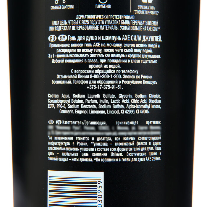 | Способ применения | Нанеси гель AXE на мочалку, слегка вспень водой и распредели по всему телу, после чего смой пену водой. 3 в 1 можешь использовать этот гель как шампунь и средство для умывания. Избегай попадания в глаза, при попадании в глаза тщательно промой их водой. |