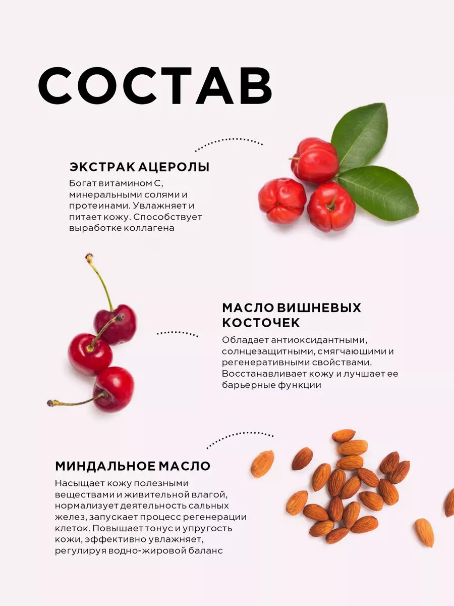 | Состав | Water/Aqua, Prunus Amygdalus Dulcis (Sweet Almond) Oil, Butyrospermum Parkii (Shea) Butter, Sodium Acrylates Copolymer, Lecithin, Macadamia Ternifolia Seed Oil, Glyceryl Stearate, Cetearyl Alcohol, Sodium Lauroyl Glutamate, Sodium Stearoyl Lactylate,Dicaprylyl Ether, Caprylic/CapricTriglyceride, Phenoxyethanol, Parfum, Allantoin, Prunus Avium (Sweet Cherry) Seed Oil, Glycerin, Malpighia Glabra (Acerola) Fruit Extract Fruit Extract, Tocopherol, Beta-Sitosterol, Squalene, Sodium Benzoate, Potassium Sorbate. |