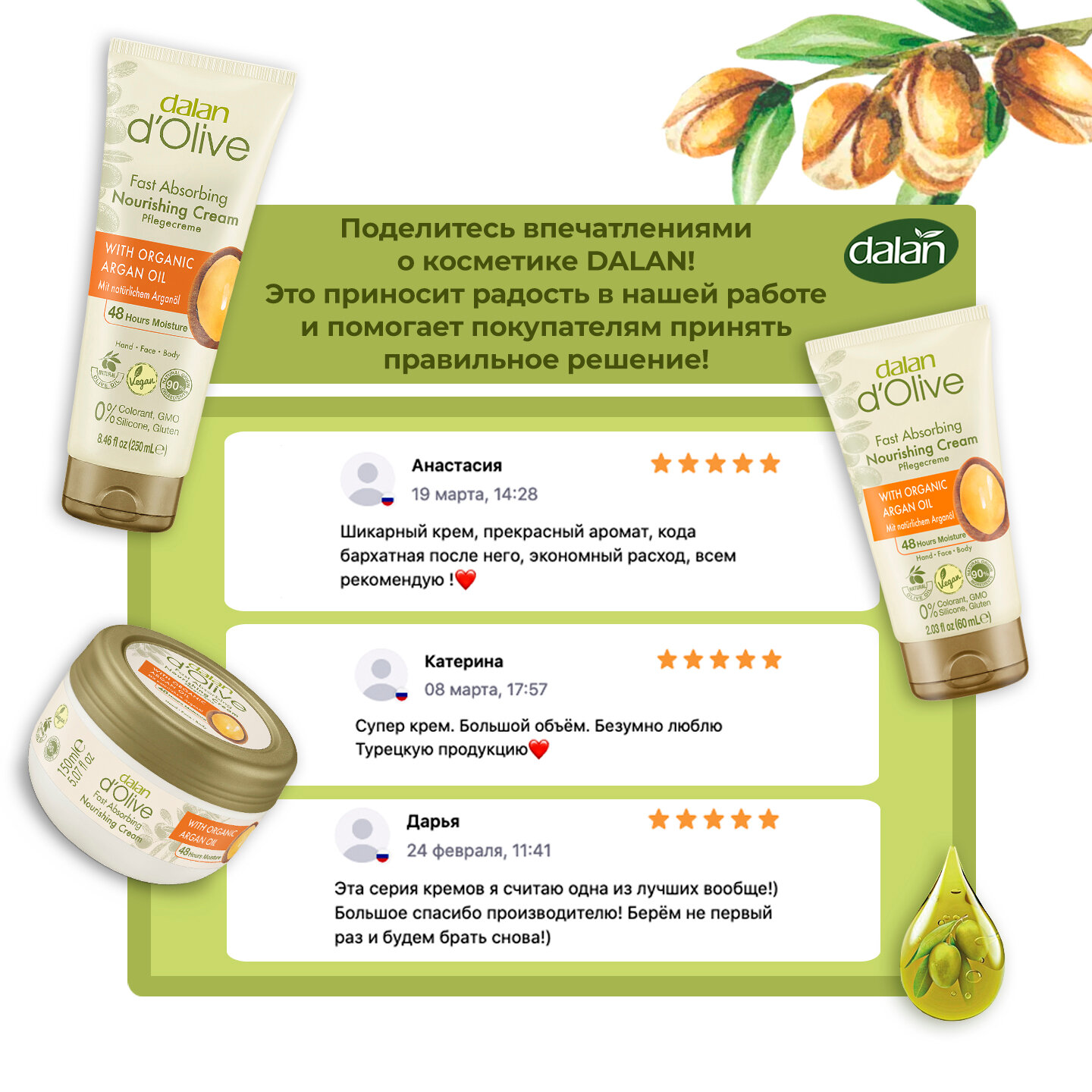 Ниже Вы можете прочитать отзывы на Питающий крем для лица, рук и тела Dalan с аргановым маслом и маслом оливы, 60 мл, ознакомится с подробными характеристиками, посмотреть интересные обзоры и фотографии на Питающий крем для лица, рук и тела Dalan с аргановым маслом и маслом оливы, 60 мл.