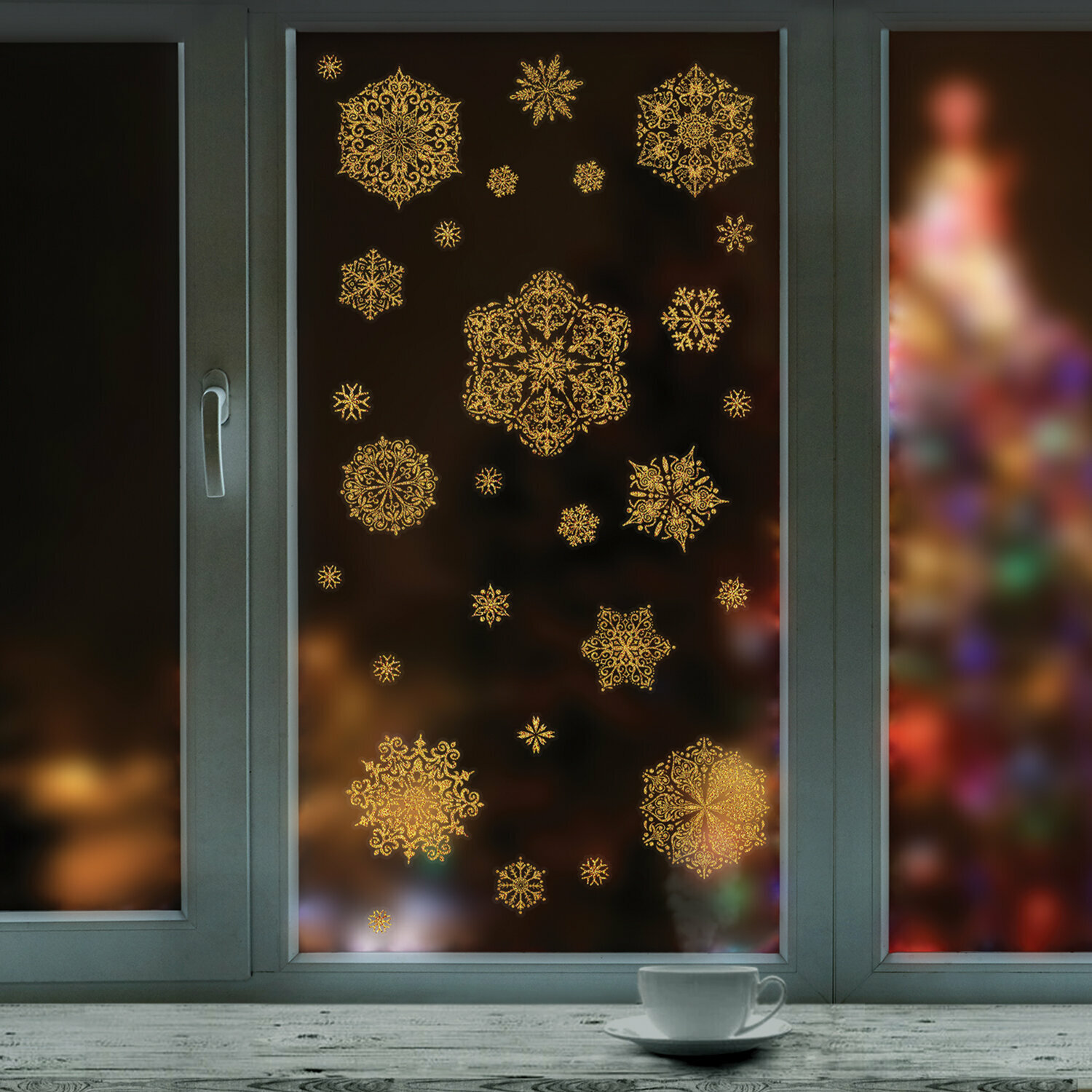 Наклейка для окон Золотая сказка двусторонняя многоразовая, 30х38 см, "Снежинки", фольга, золото