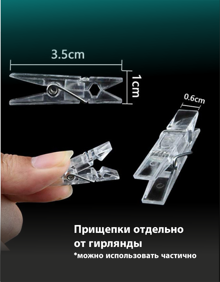 | Комплектация | Гирлянда - 1 шт., Прищепки |