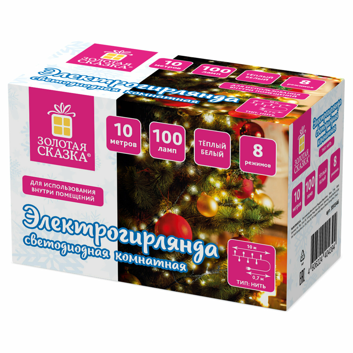 Электрогирлянда-нить комнатная Золотая сказка Стандарт, 10 м, 100 LED, холодный белый свет, 220 V, контроллер