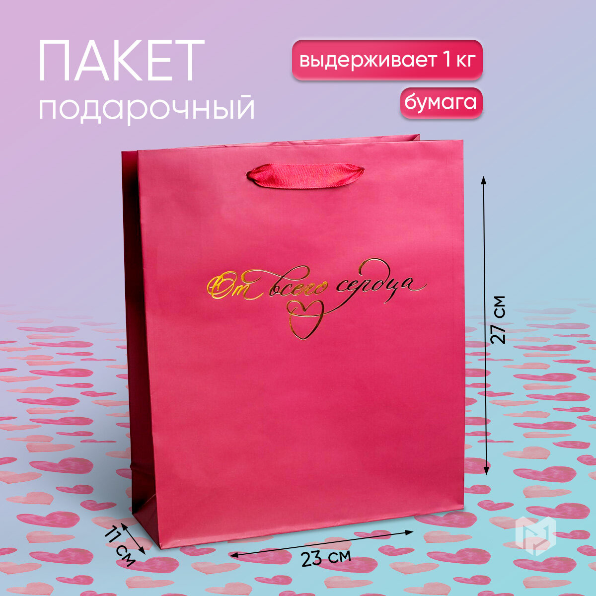 Пакет подарочный ламинированный вертикальный, упаковка, "От всего сердца", ML 23 x 27 x 11.5 см
