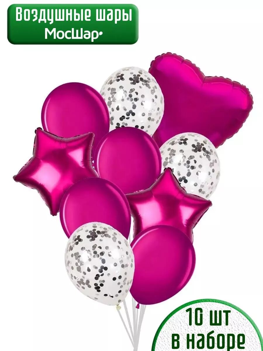 Купить Набор воздушных шаров на день рождения с шариками конфетти фуксия серебро - 10шт