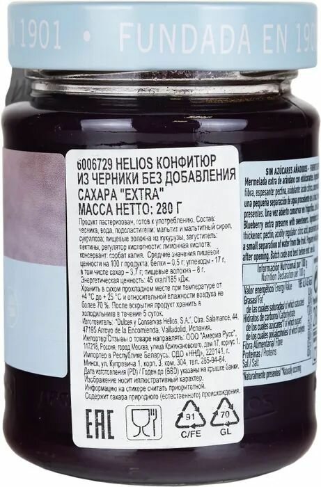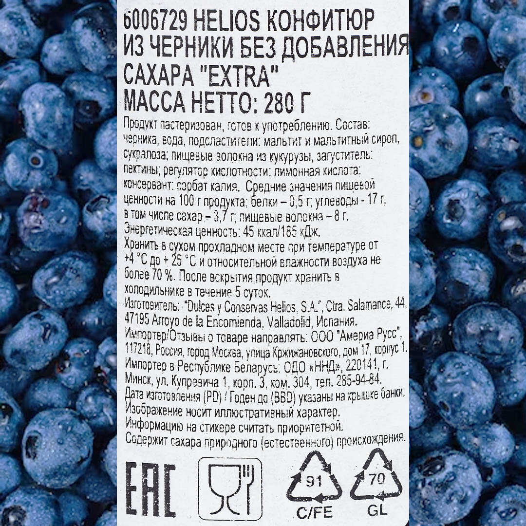 Конфитюр HELIOS (Хелиос) Extra, черничный, без сахара, 280 г