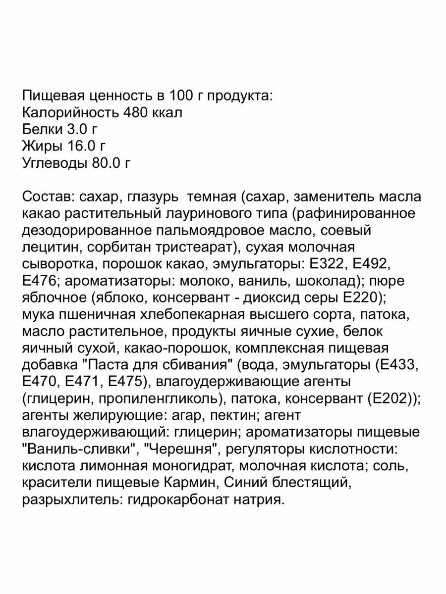 | Состав | Сахар, мука пшеничная хлебопекарная высшего сорта, масло растительное, заменитель молочного жира (рафинированные дезодорированные модифицированные растительные масла: пальмовое, рапсовое, соевое, эмульгаторы Е471, Е322 (соевый лецитин)); патока, продукты яичные сухие, сухое обезжиренное молоко, комплексная пищевая добавка "Паста для сбивания" (вода, эмульгаторы (Е433, Е470, Е471, Е475), влагоудерживающие агенты (глицерин, пропиленгликоль), патока, консервант (Е202)); агент влагоудерживающий: глицерин; загуститель: крахмал кукурузный; разрыхлитель: гидрокарбонат натрия; соль, стабилизаторы: каррагинан, дикалий фосфат; ароматизатор пищевой "Мед", консервант: сорбат калия; регуляторы кислотности: лактат кальция, кислота лимонная моногидрат. |