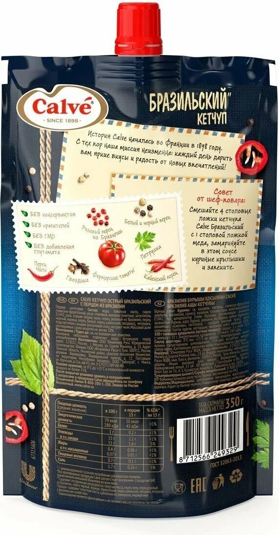 | Дополнительная информация | Комплектация: «Calve», кетчуп «Бразильский», 2 шт по 350 г Срок годности: 9 месяцев |