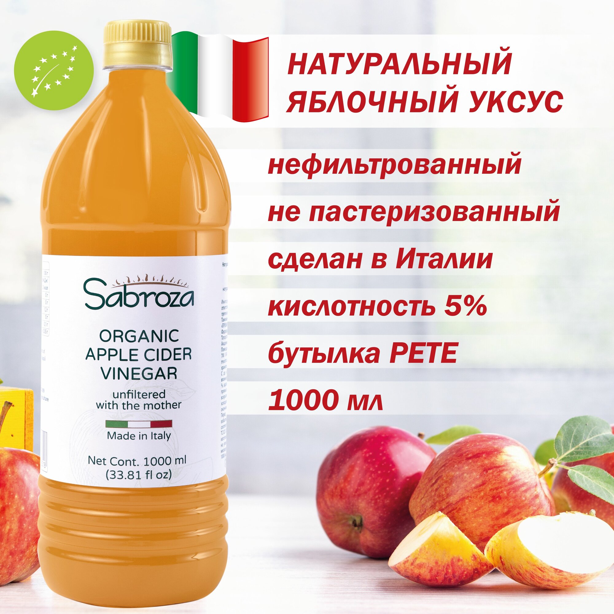 Купить 1 литр, Яблочный Уксус Натуральный Нефильтрованный, Непастеризованный, из Италии, Sabroza, c уксусной маткой, ПЭТ бутылка