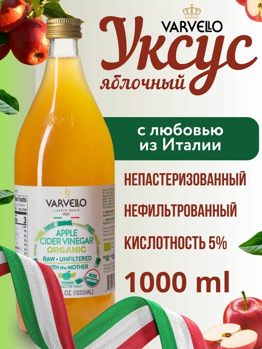 Яблочный уксус натуральный, 1 литр, нефильтрованный, непастеризованный, в стекле, Varvello интересное:
