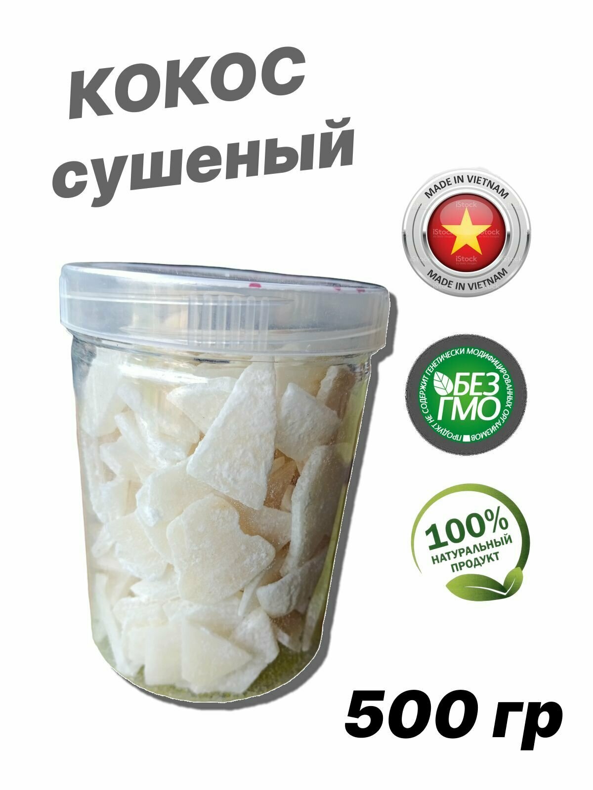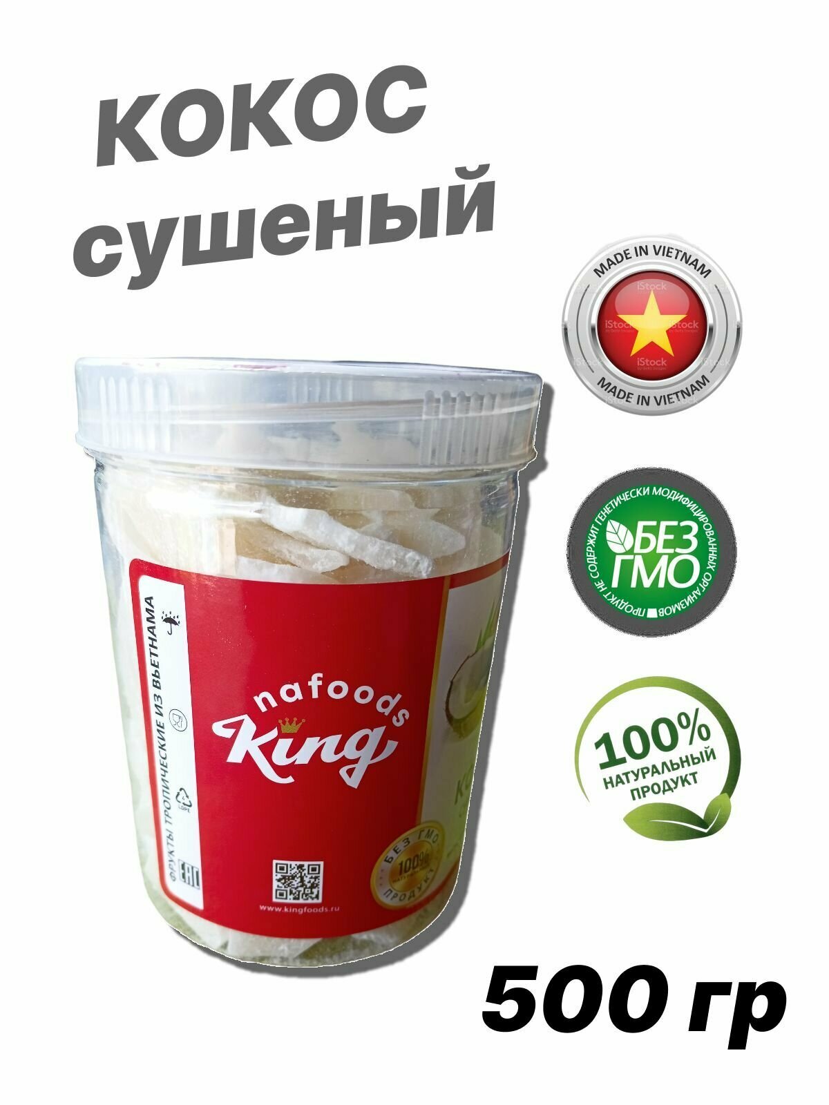 Натуральный сушенный Кокос KING, пластиковая банка 500 гр