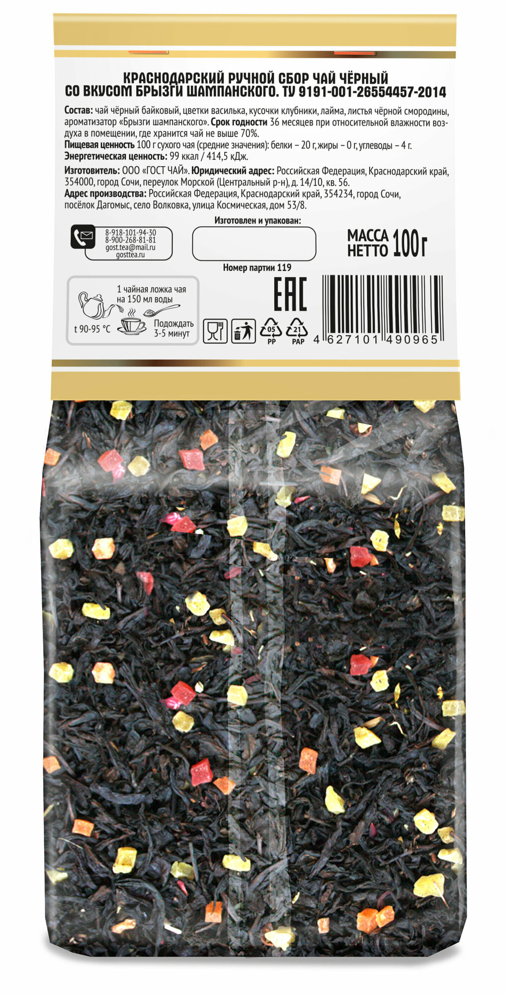| Состав набора | чай черный; лесные ягоды (Чай черный байховый, ягоды черники, малины, черной смородины,ежевики, шиповника, облепихи, листья малины и ежевики); брызги шампанского(Чай черный байховый, цветки василька, кусочки клубники, лайма,листья черной смородины, вкус сливок) |