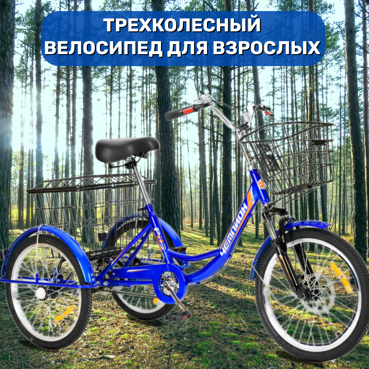 Трехколесный велосипед взрослый синий РВЗ Чемпион 20, с корзиной интересное: