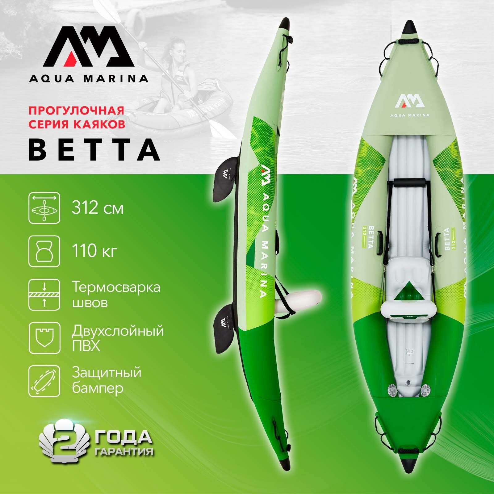 Каяк надувной одноместный с веслом Aqua Marina Betta-312 размеры 312x80 см, макс 110 кг, в комплекте сумка, насос, сиденье весло плавник (BE-312) интересное: