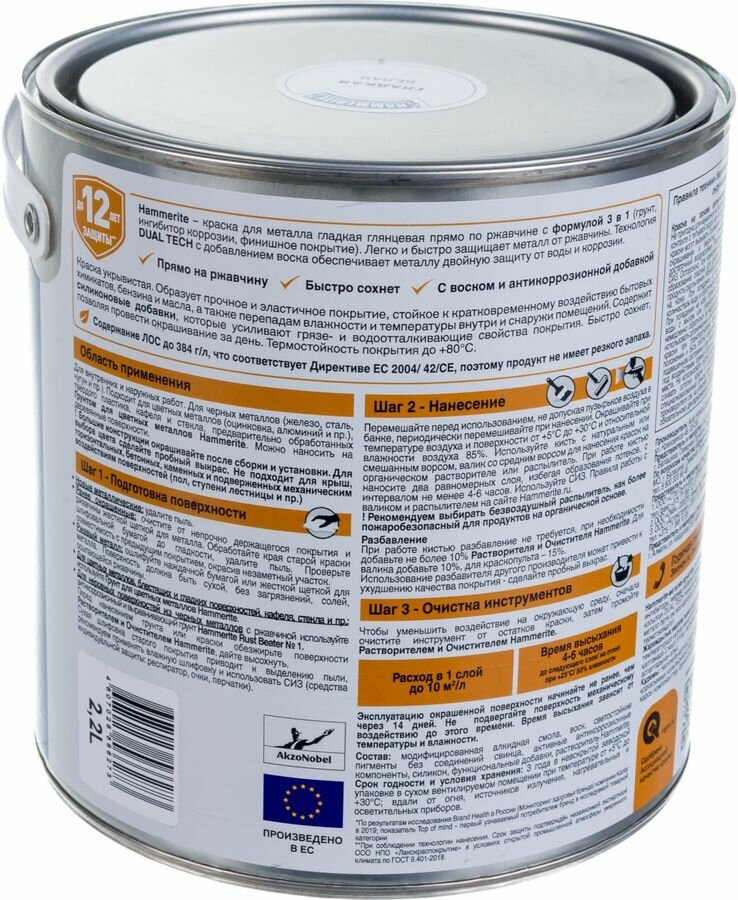 Краска для металла 3 в 1 прямо на ржавчину Hammerite гладкая глянцевая (2л) синий RAL 5005