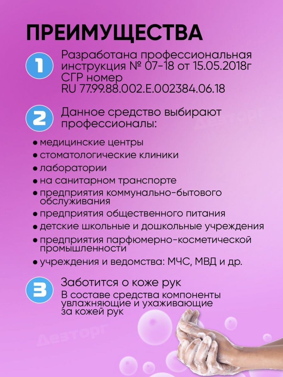 | Состав | полигексаметиленгуанидин гидрохлорид, алкилдиметилбензиламмоний хлорид, ухаживающие за кожей компоненты, в том числе растительные экстракты и масла, и другие функциональные добавки |