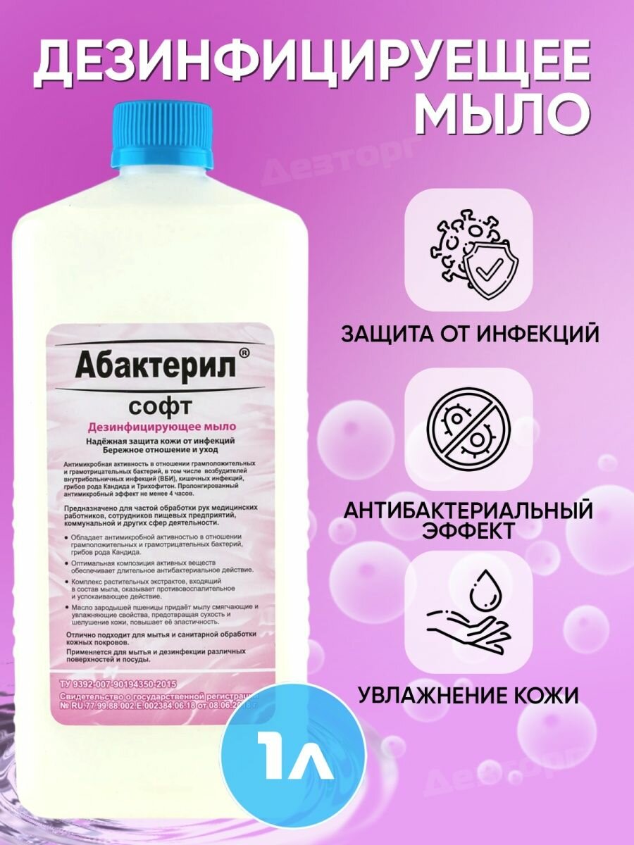19 шт. Абактерил-Софт, дезинфицирующее мыло 1 л. ГОСТ 12.1.007-76